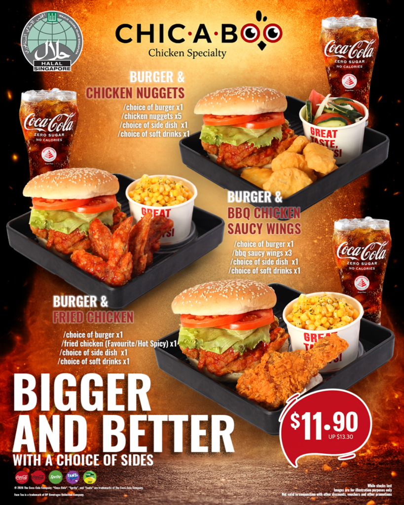 Chicaboo 🐔 Burger Bundle Deal is here to satisfy your hunger! Choose either Crispy Fried Chicken, Saucy Wings, or Chicken Nuggets to pair with your favourite burger, including a choice of side and regular soft drink – at only S$11.90 (U.P. 13.30)! Only available from 15 Oct to 30 Nov. While stocks last.